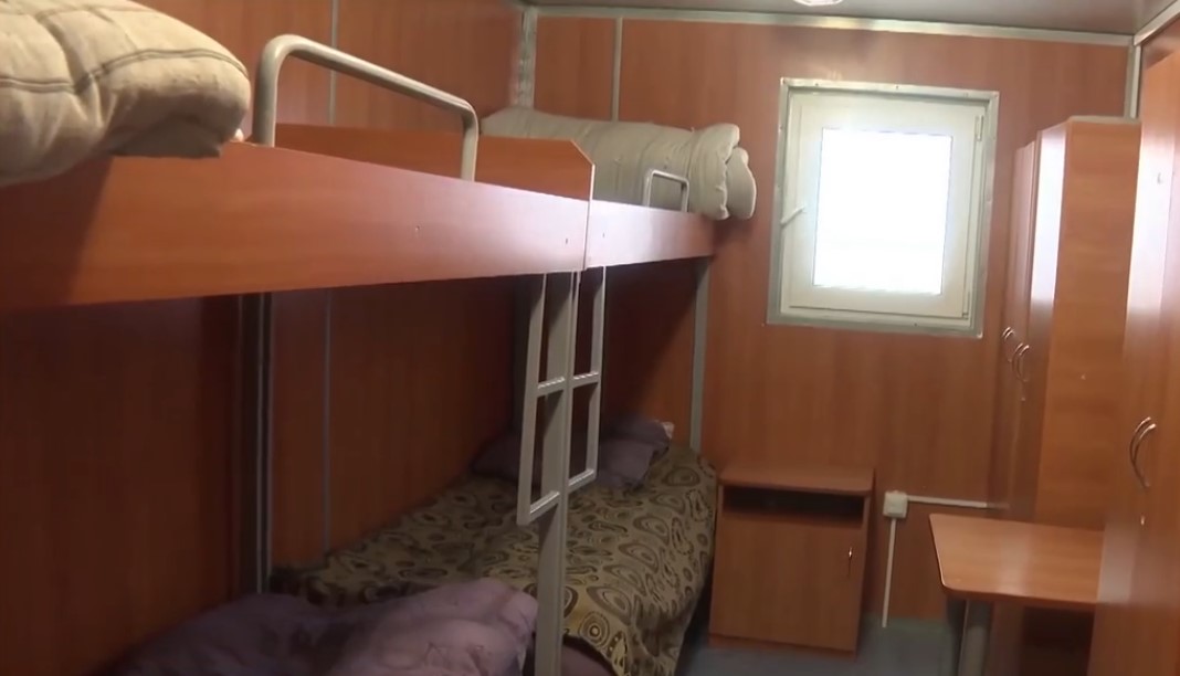 На территории комплекса есть столовая, кухня, электроэнергией обеспечивают дизель-генераторы, в отдельном помещении можно принять душ и переночевать – на территории установлены 6 жилых модулей, каждый — на 8 человек.