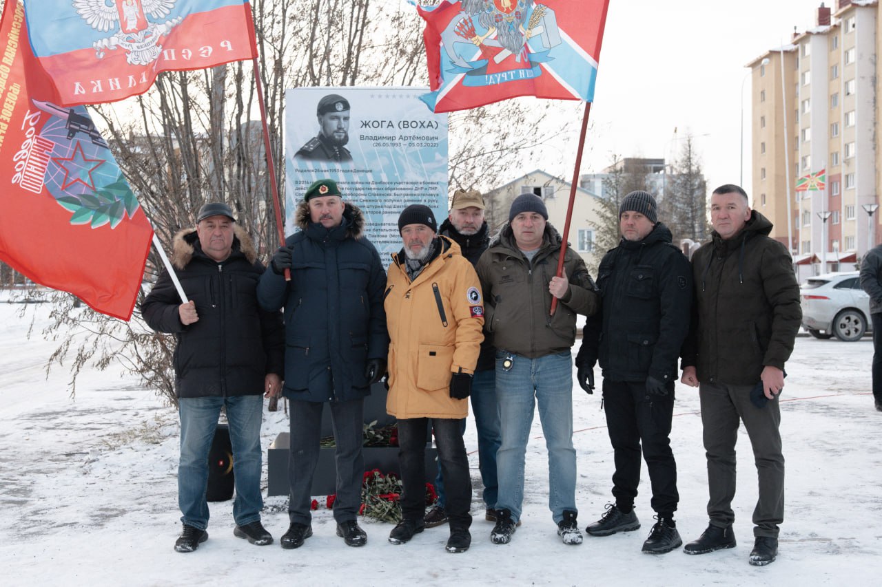 В Новом Уренгое на Аллее Мужества неподалёку от проезда, который носит имя легендарного командира разведбатальона «Спарта», открыли памятный знак Владимиру Жоге — Герою России и Герою Донецкой Народной Республики.